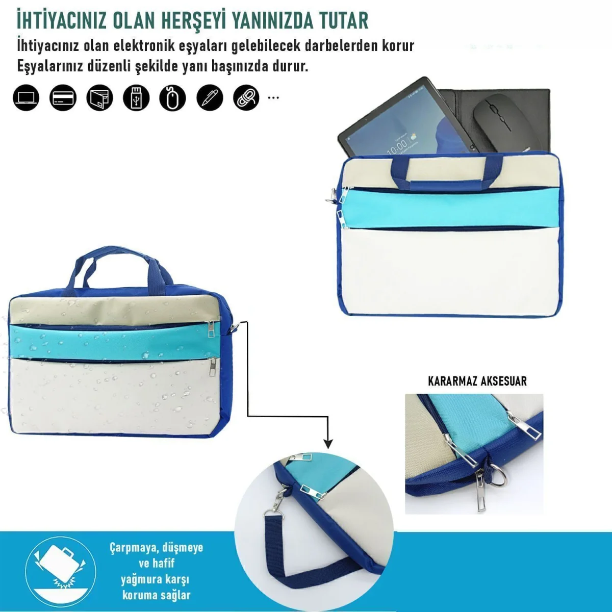 aksesuarlarınızı korumak için harika bir çanta. Ürünümüzde kararmaz aksesuarlar kullanılmıştır. Ayrıca ürünümüzün büyük olan bölümünde hava yastığı özelliğinde bulunan kaliteli köpükten yapılmış darbe emici yüzey sayesinde laptop macbook veya herhangi elektronik cihazınız asla zarar görmez.