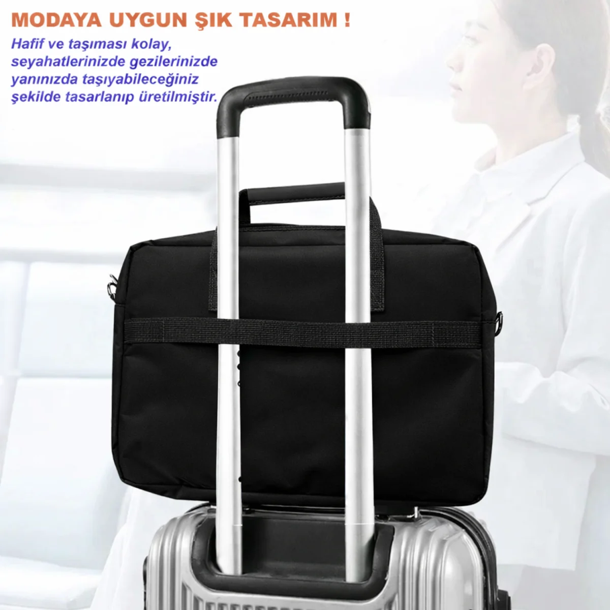 Çıkarılabilir omuz askısı ile elde veya çapraz şekilde taşınabilir. Arka tarafında, bagaja konulabilen bir bagaj askısı vardır, bu da iş seyahatlerinde yanınızda taşıma olanağı tanır.