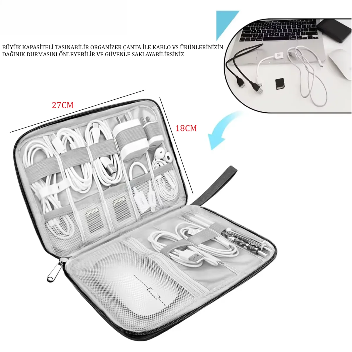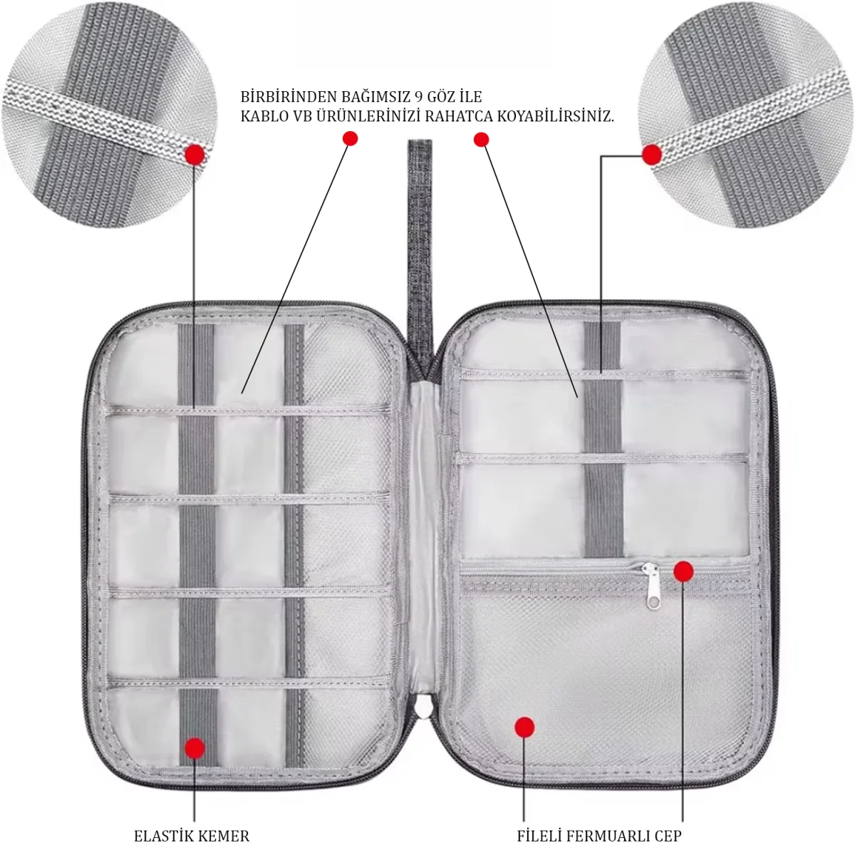 Çok gözlü organizer çanta, günlük hayatta ve seyahatlerde eşyalarınızı düzenli bir şekilde taşımanızı sağlayan pratik ve şık bir çözümdür. 9 farklı bölmesi sayesinde telefon, cüzdan, makyaj malzemeleri, kablolar, kulaklık ve diğer kişisel eşyalarınızı kolayca organize edebilirsiniz. 27x18 cm ölçülerindeki kompakt tasarımı ile fazla yer kaplamadan çantanızın içinde düzen sağlar. Ayrıca fermuarlı iç cebi sayesinde önemli eşyalarınızı güvenli bir şekilde saklamanıza olanak tanır.