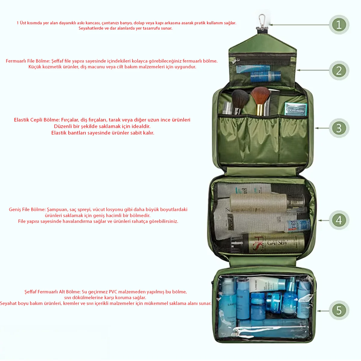 Çok Bölmeli Düzenleyici Çanta – Şampuan, losyon, diş macunu, makyaj malzemeleri ve kişisel bakım ürünleri için özel tasarlanmış geniş bölmelere sahiptir.